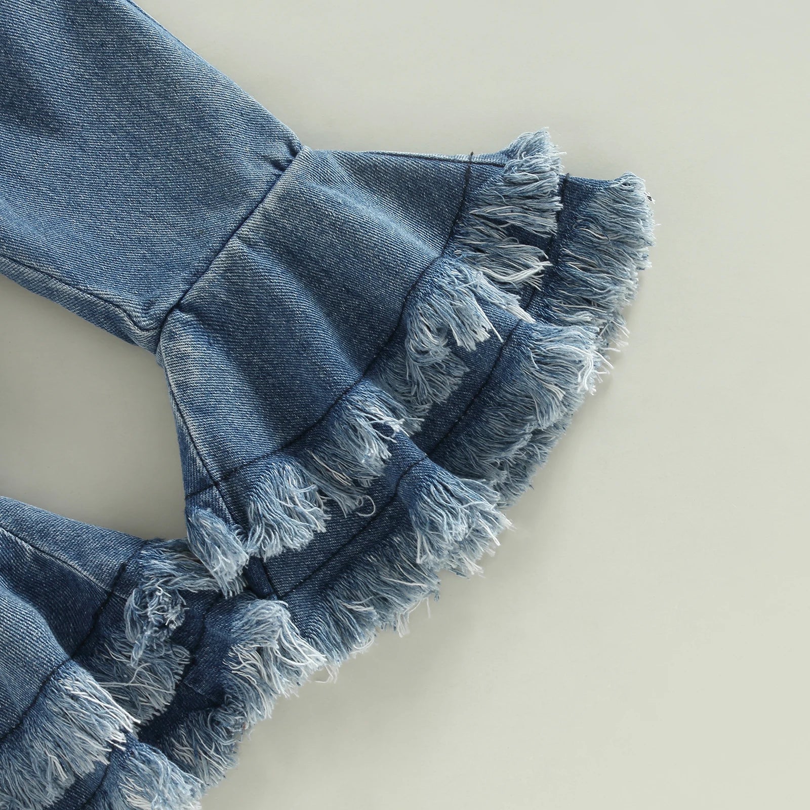 Kids Girls Pants Suit, Long Sleeve Round Neck Lace Romper Tops + Casual Denim Bell-Bottoms + HeadbandSize(cm)