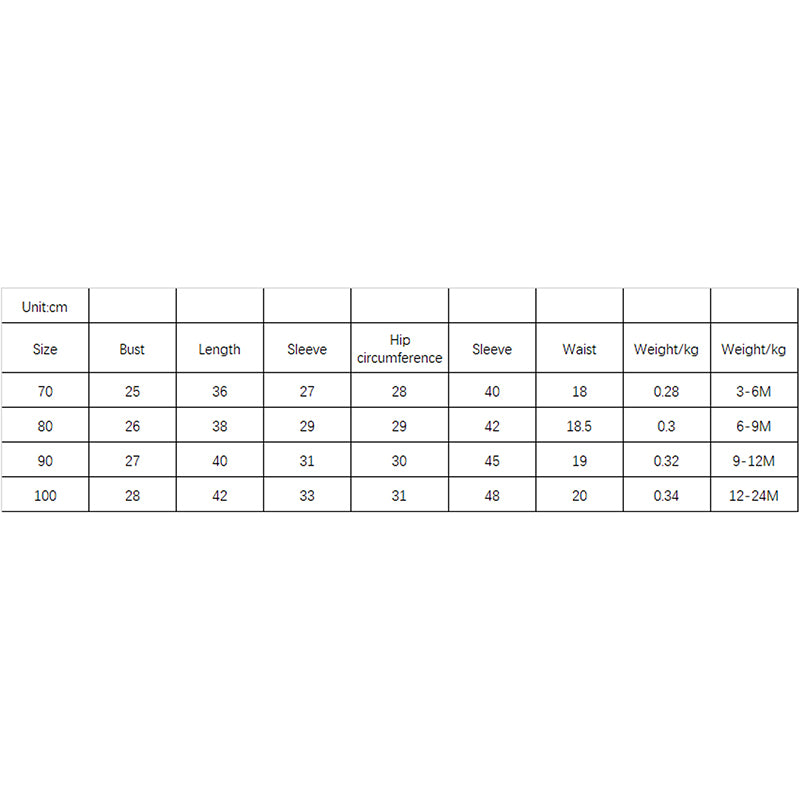 Recommended Age: 3-6 Months Tops Length: 14.17 Bust: 19.69 Pants Length: 15.75 Waist: 14.17