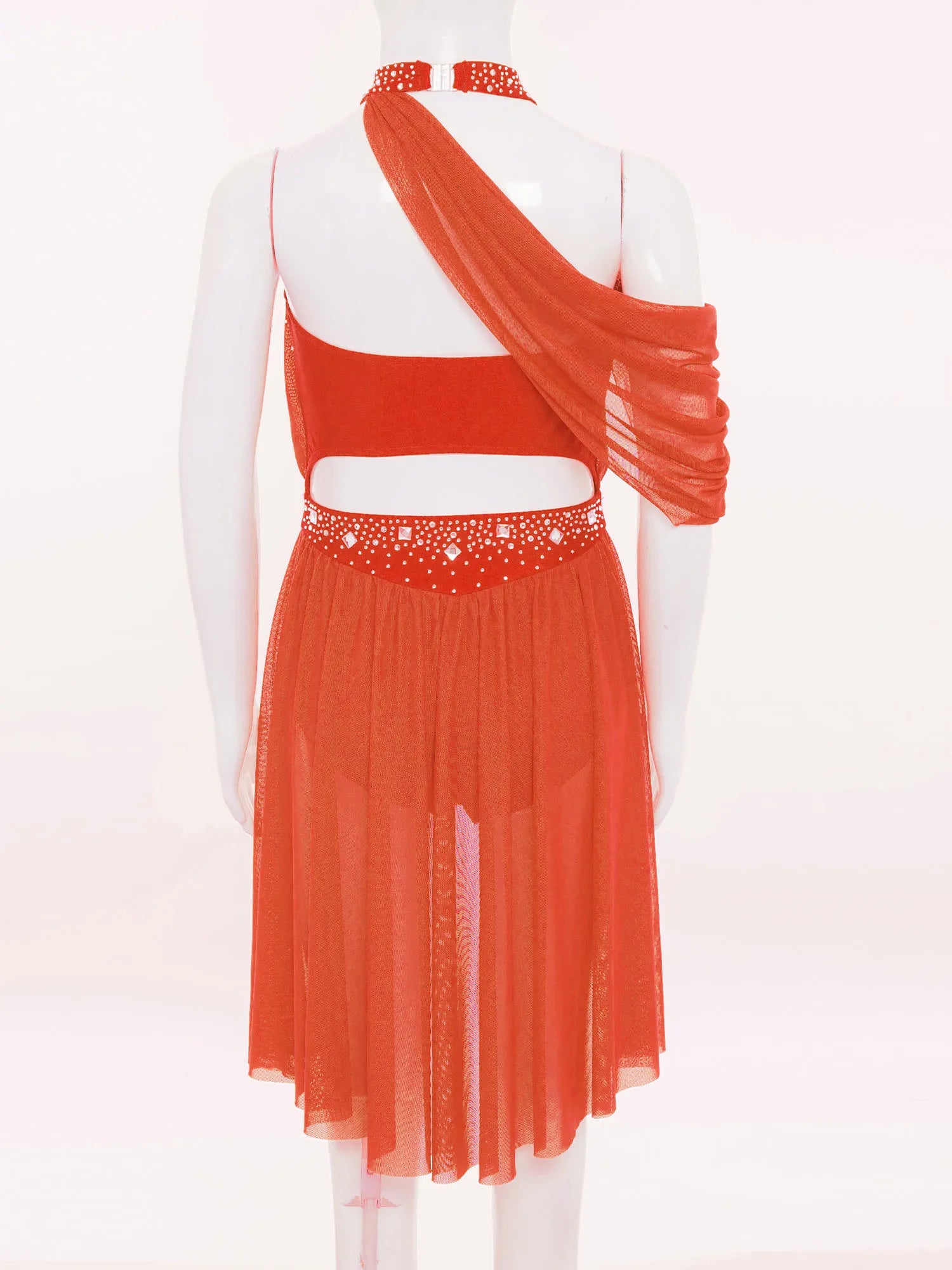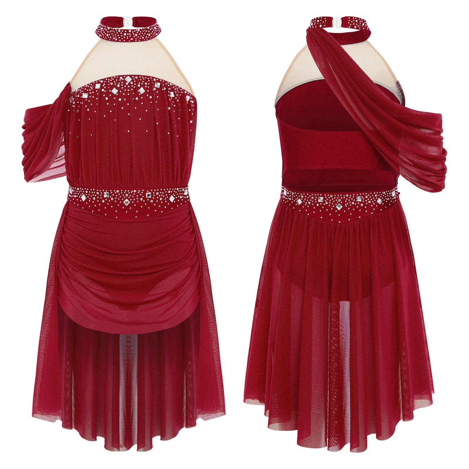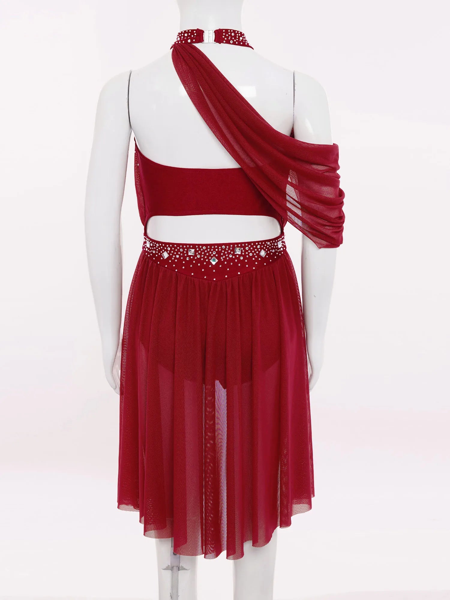 Kids Girls Lyrical Dance Leotard Dress Halter Backless Cutout Back Shiny Rhinestones Ruched Mesh Drape Dresses Modern Dancewear