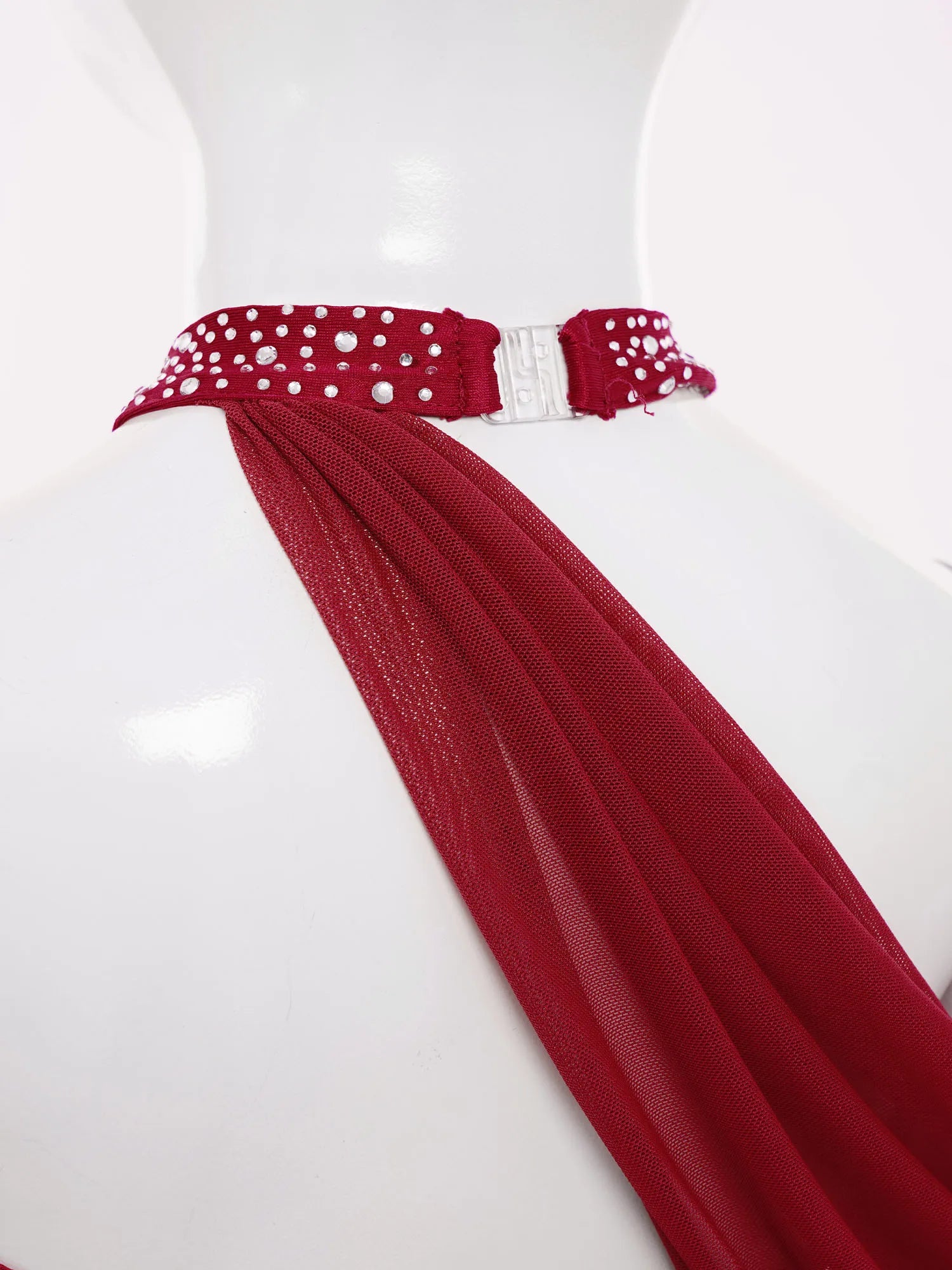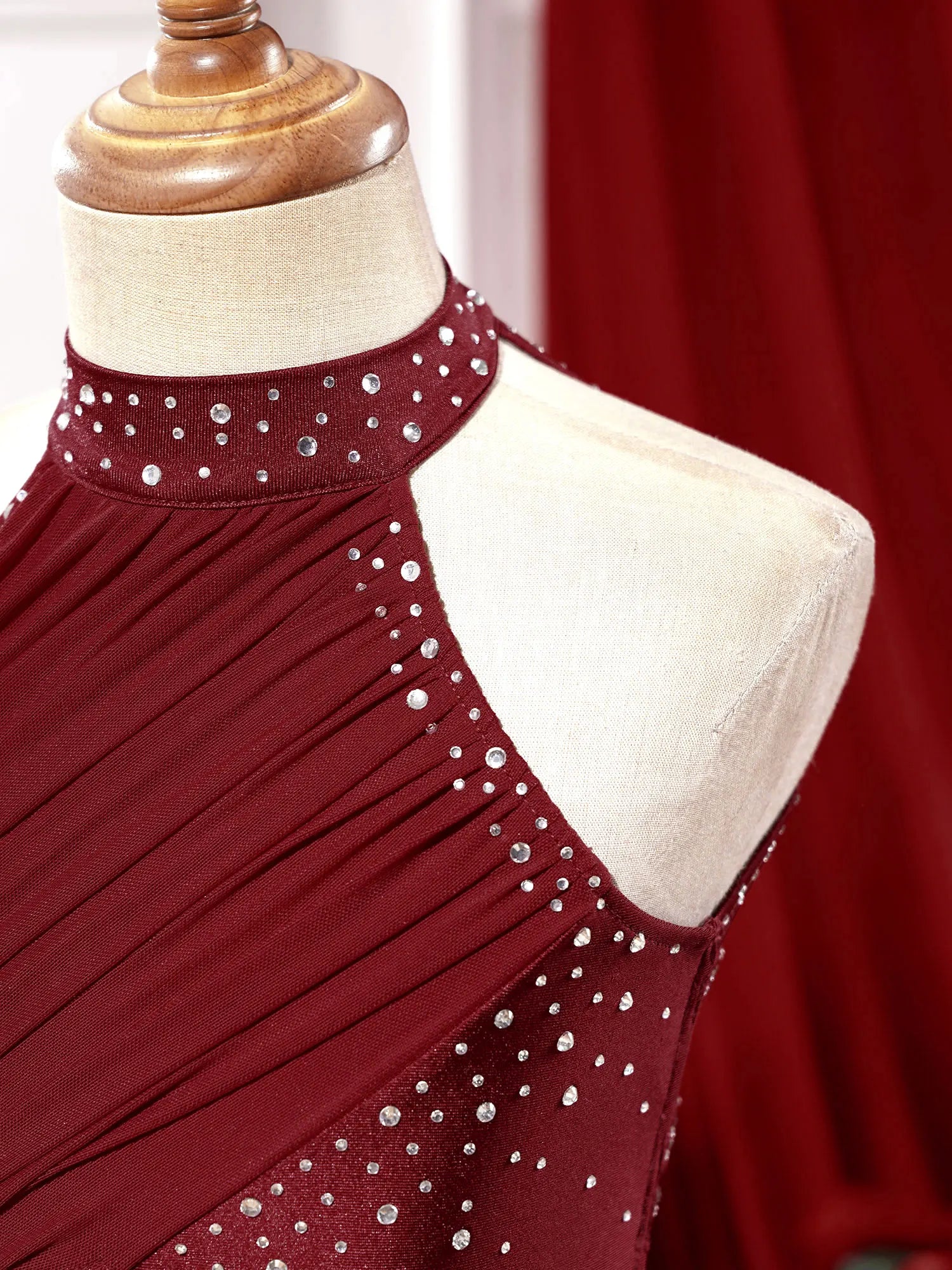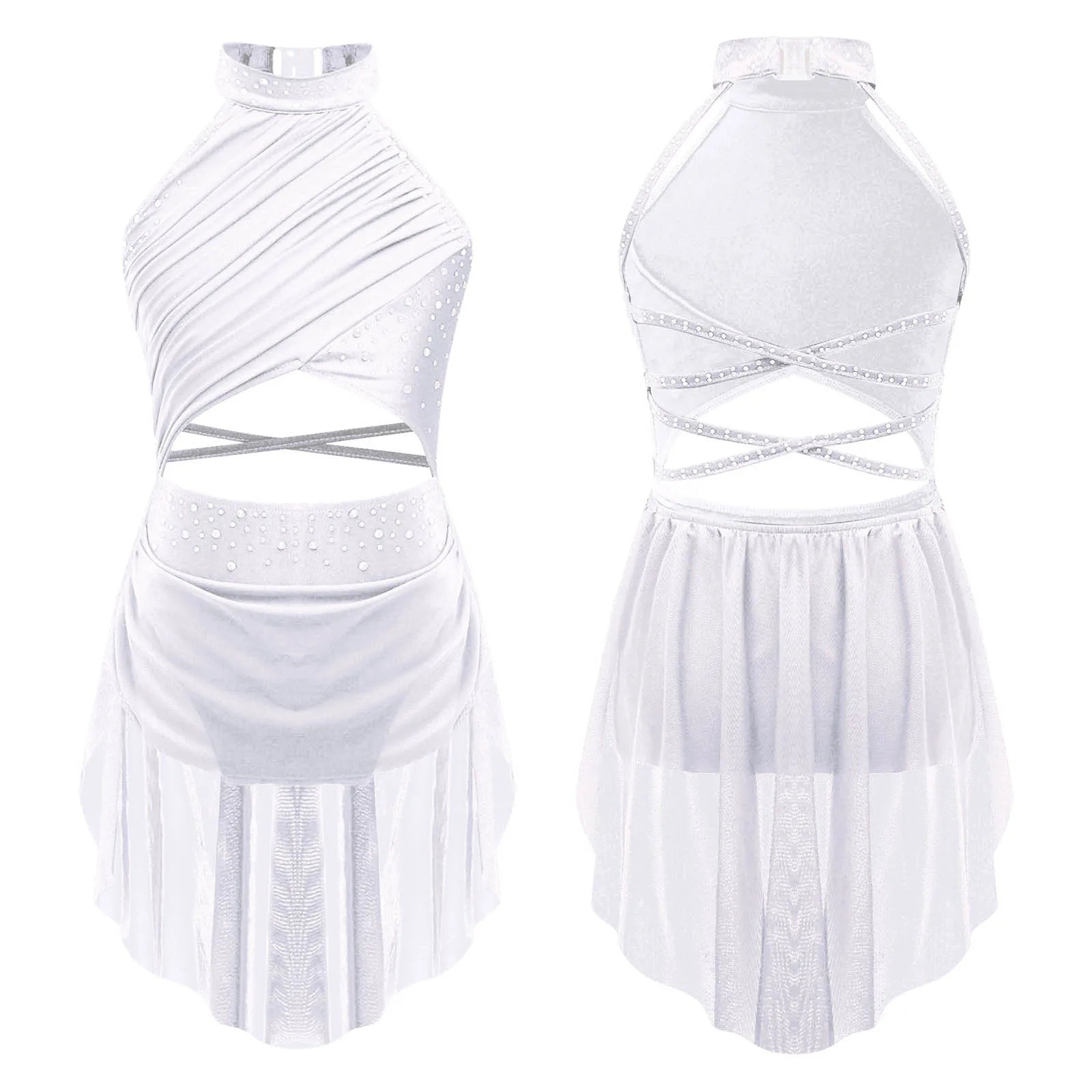 Kids Girls Lyrical Dance Leotard Dress Halter Backless Cutout Back Shiny Rhinestones Ruched Mesh Drape Dresses Modern Dancewear