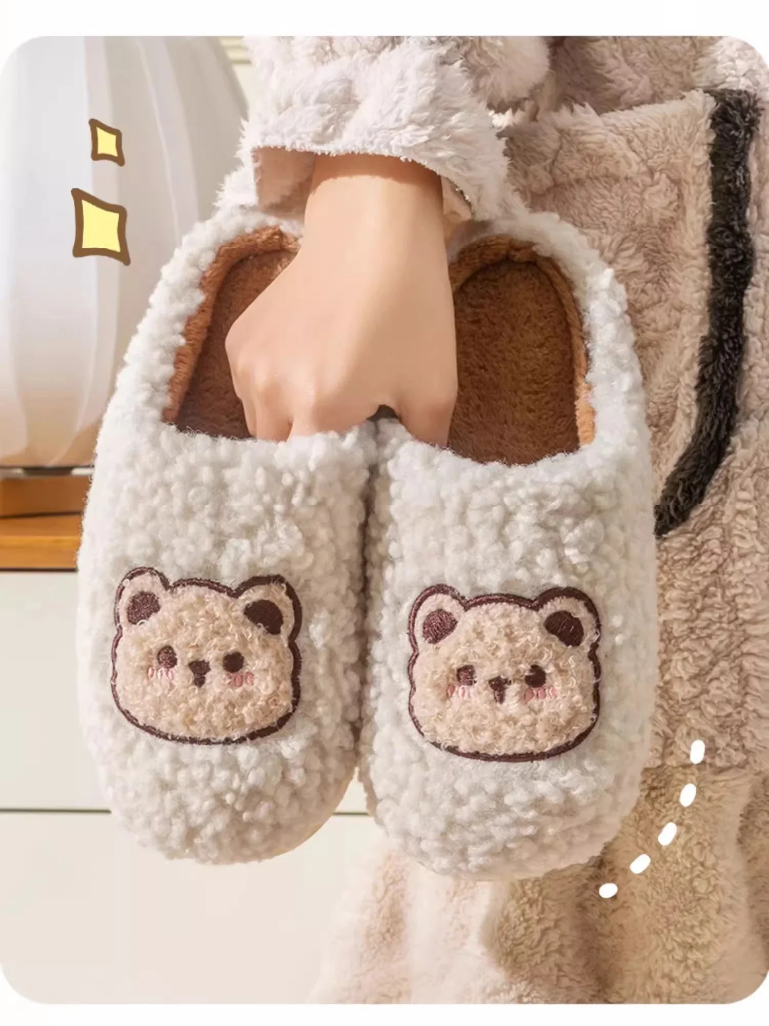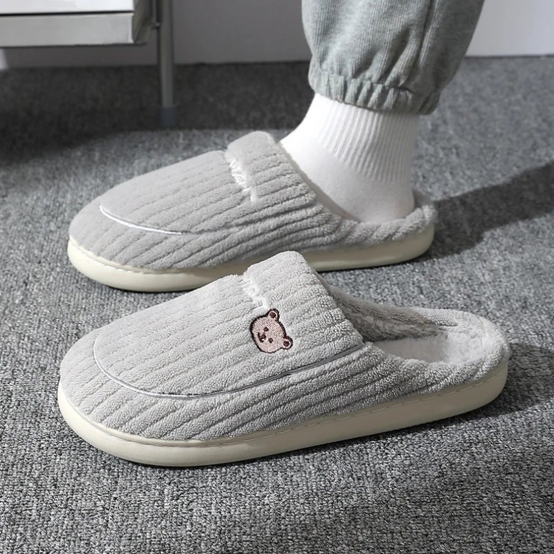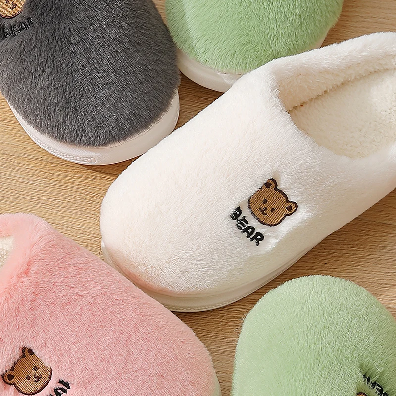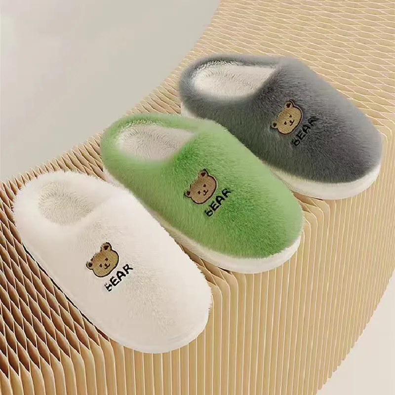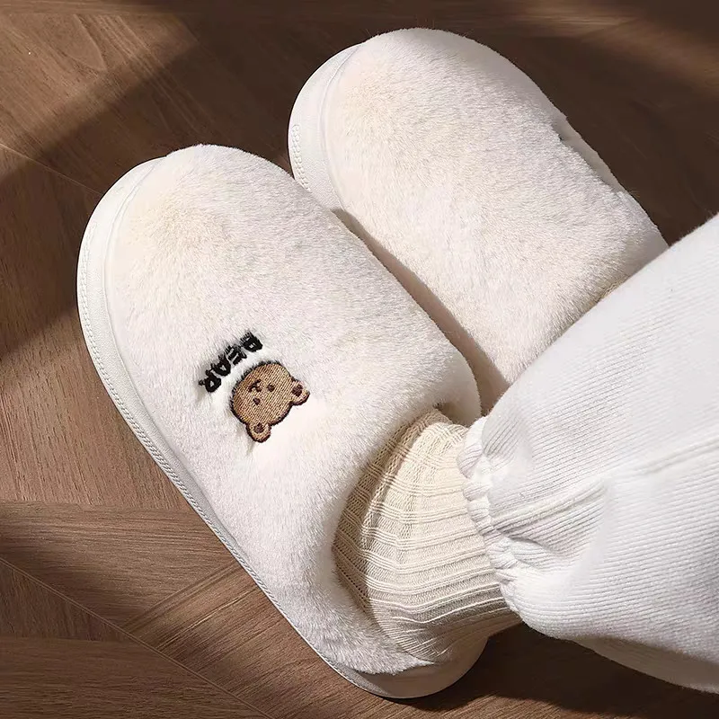 New Women Home Slippers Men Furry Indoor Bedroom Flats Warm Plush Couples Cute Cartoon Bear Winter Floor Slides Non-slip Shoes
